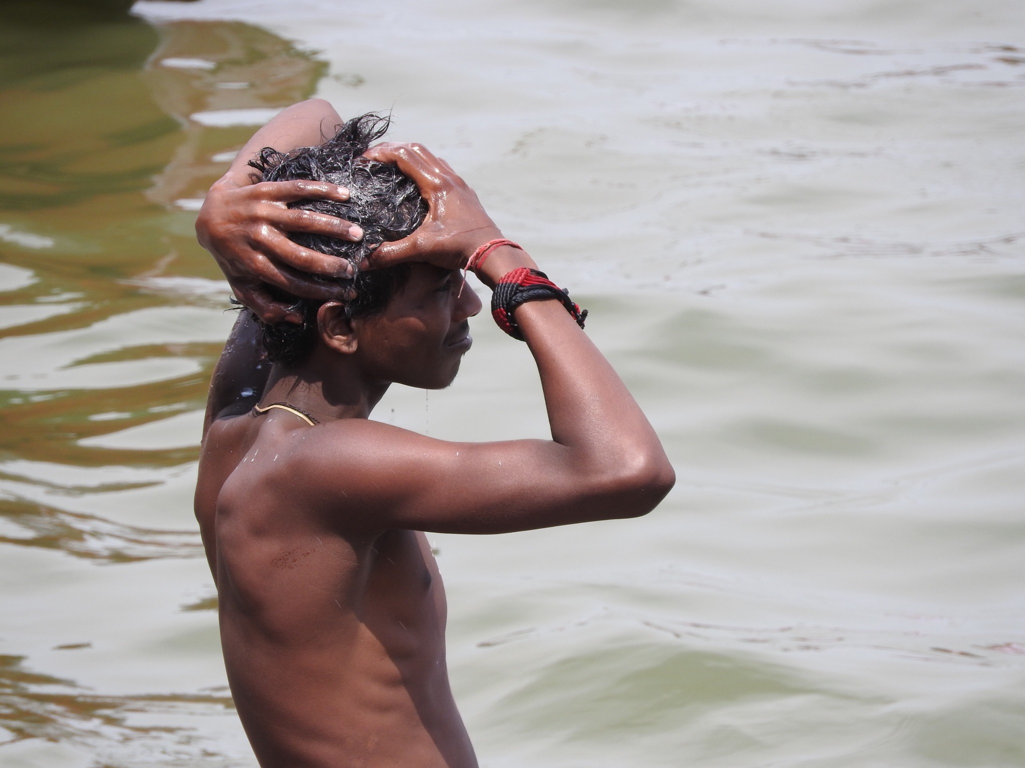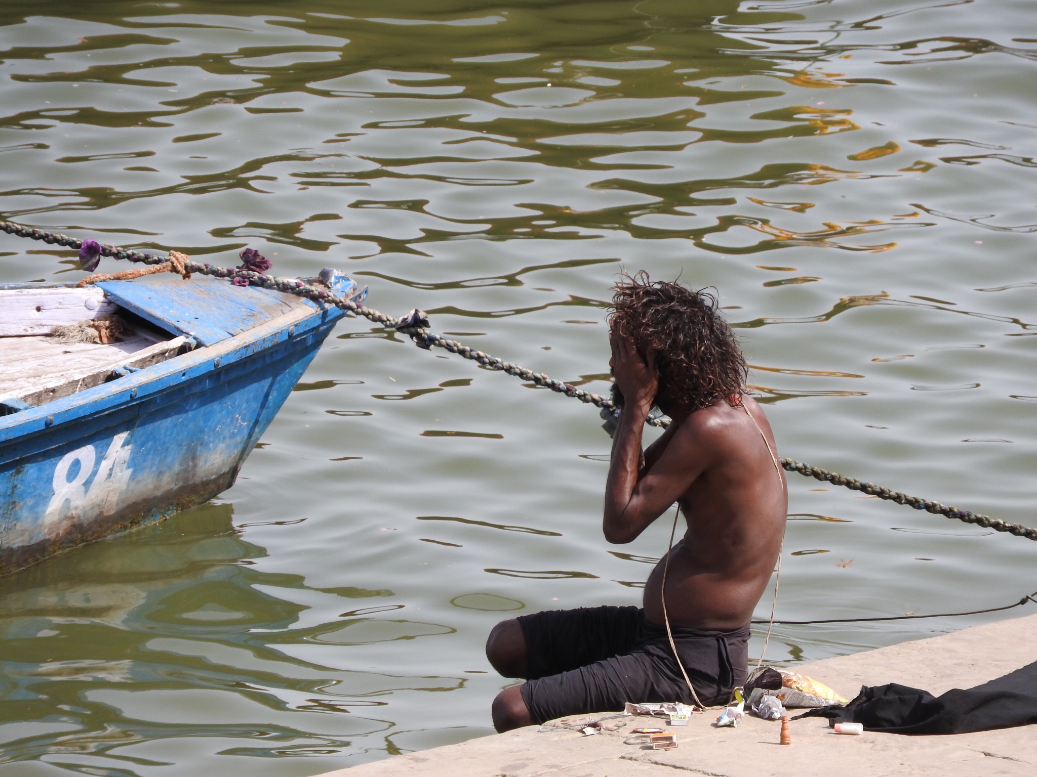 Na onze brunch maken we een wandeling langs de ghats van de Ganges. De fascinerende uitzichten volgen elkaar in razendsnel tempo op. We zien priesters, bedelaars, pelgrims, koeien, mensen die zich ritueel baden, kleding die gewassen wordt, kinderen die langs de waterlijn cricket spelen, jongeren die stiekem hand in hand op de stenen trappen zitten, majestueuze gebouwen,… Plots roept iemand “this way, burning ghat”. Nieuwsgierig volgen we hem en daar zien we de vuren branden. Het vuur van de crematies. Iedereen die sterft in Varansi bereikt onmiddellijk ‘moksha’, verlichting. Vele Indiaers komen naar Varanasi om er te sterven en hun as wordt uitgestrooid in de Ganges. Het is al lang verboden om een lichaam in zijn geheel te water te laten en toch worden we door ‘onze gids’ gewezen op het lichaam van een dode man. Hij vertelt dat deze man, ondanks het verbod, zal verzwaard worden met stenen en zonder verbranding aan de Ganges zal gegeven worden. Ik kijk naar het gezicht van de dode man, tot mijn verbazing doet het me weinig.